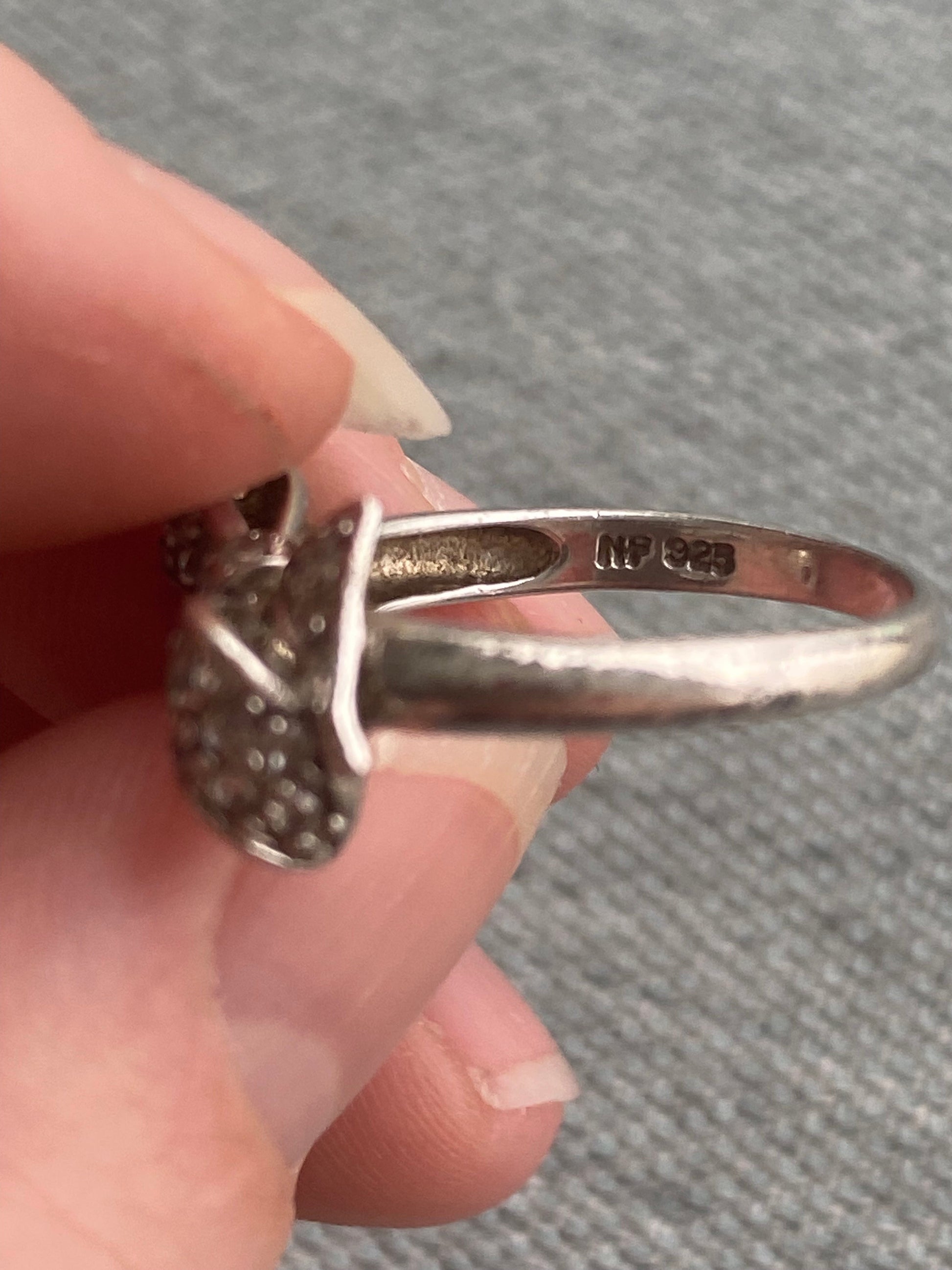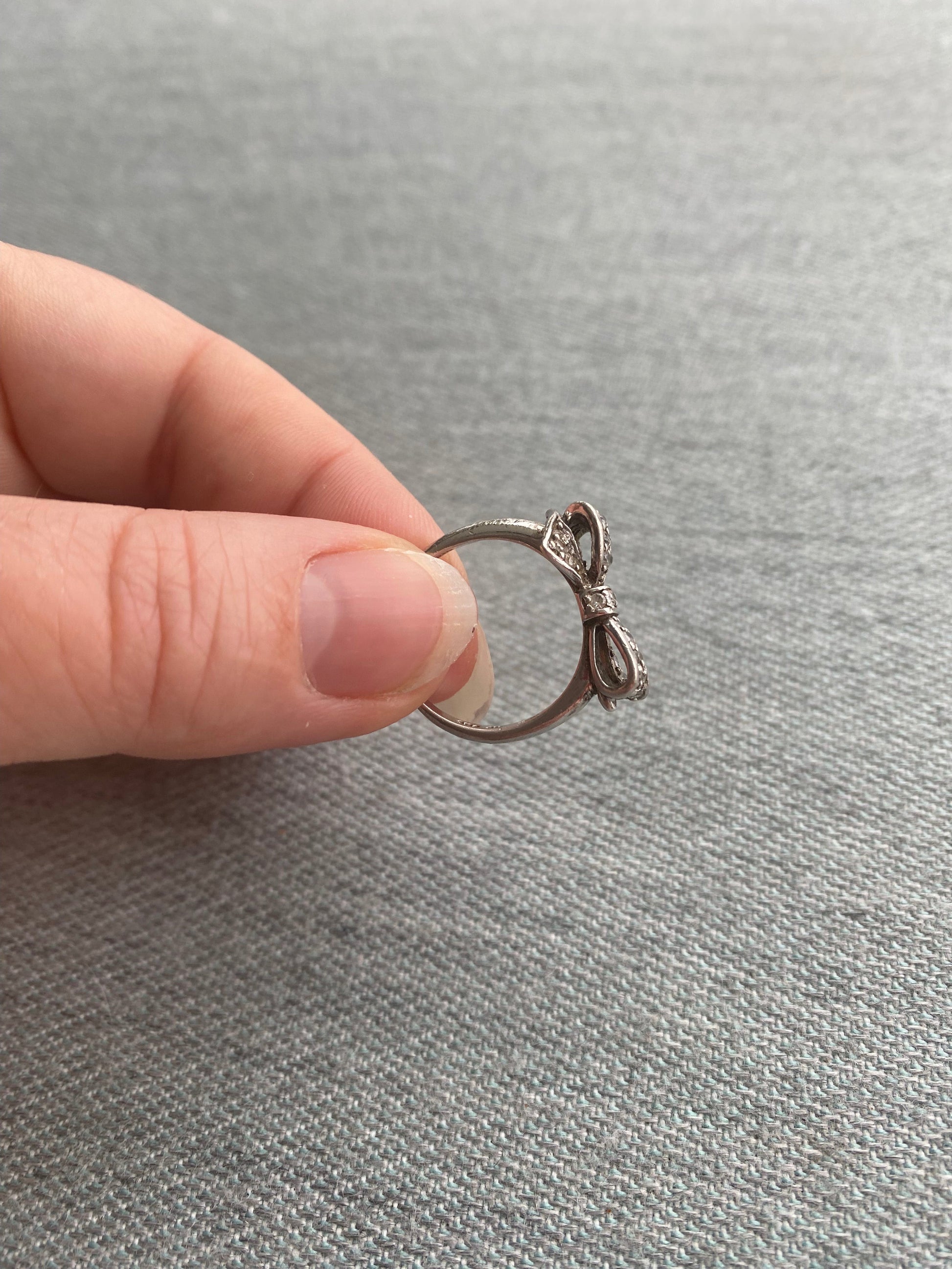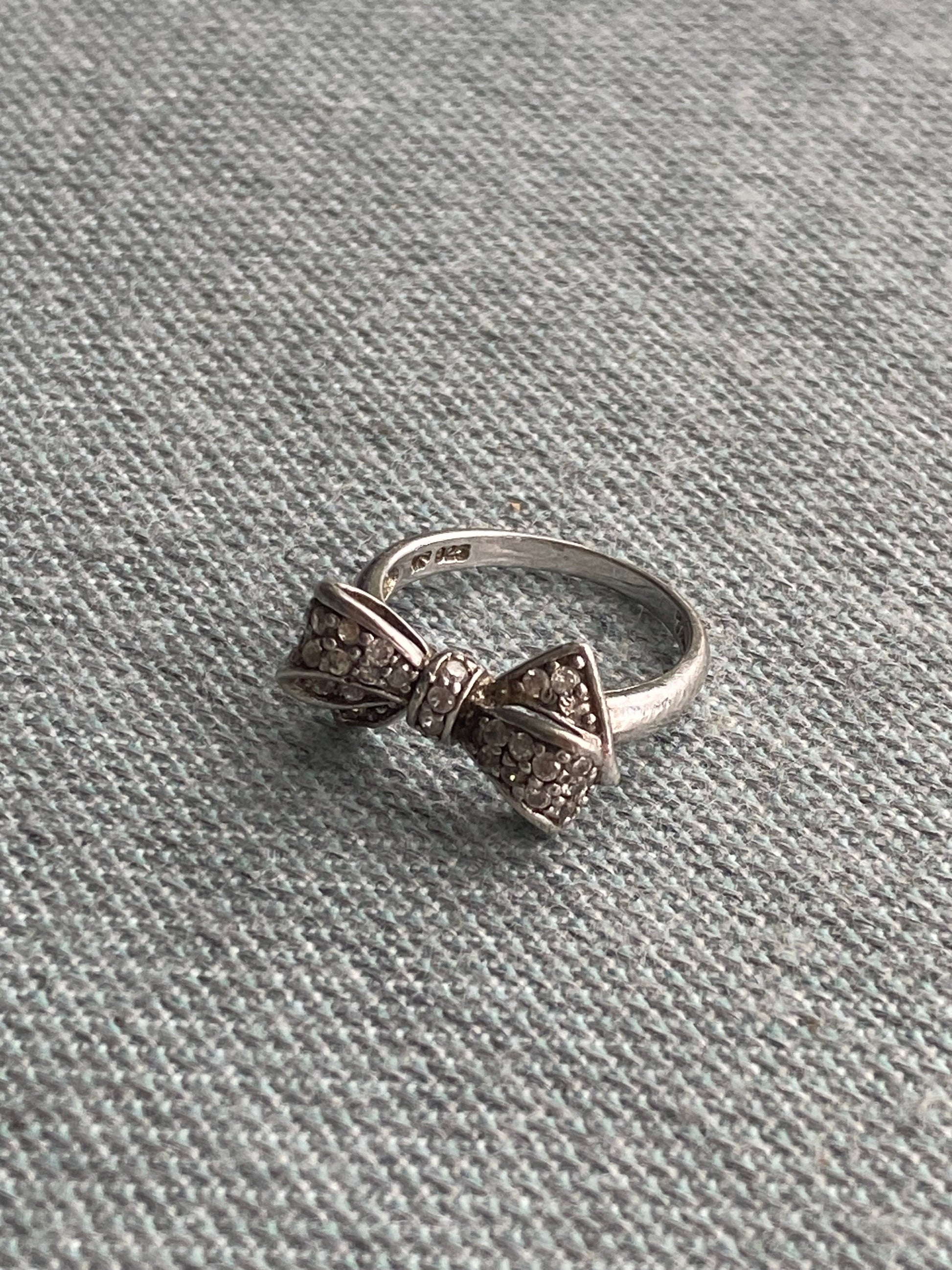 Sweet little bow ring, made of sterling silver, adorned with CZ stones.