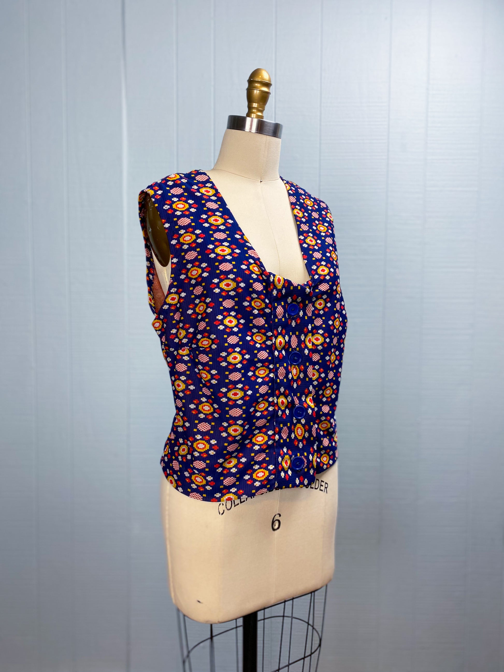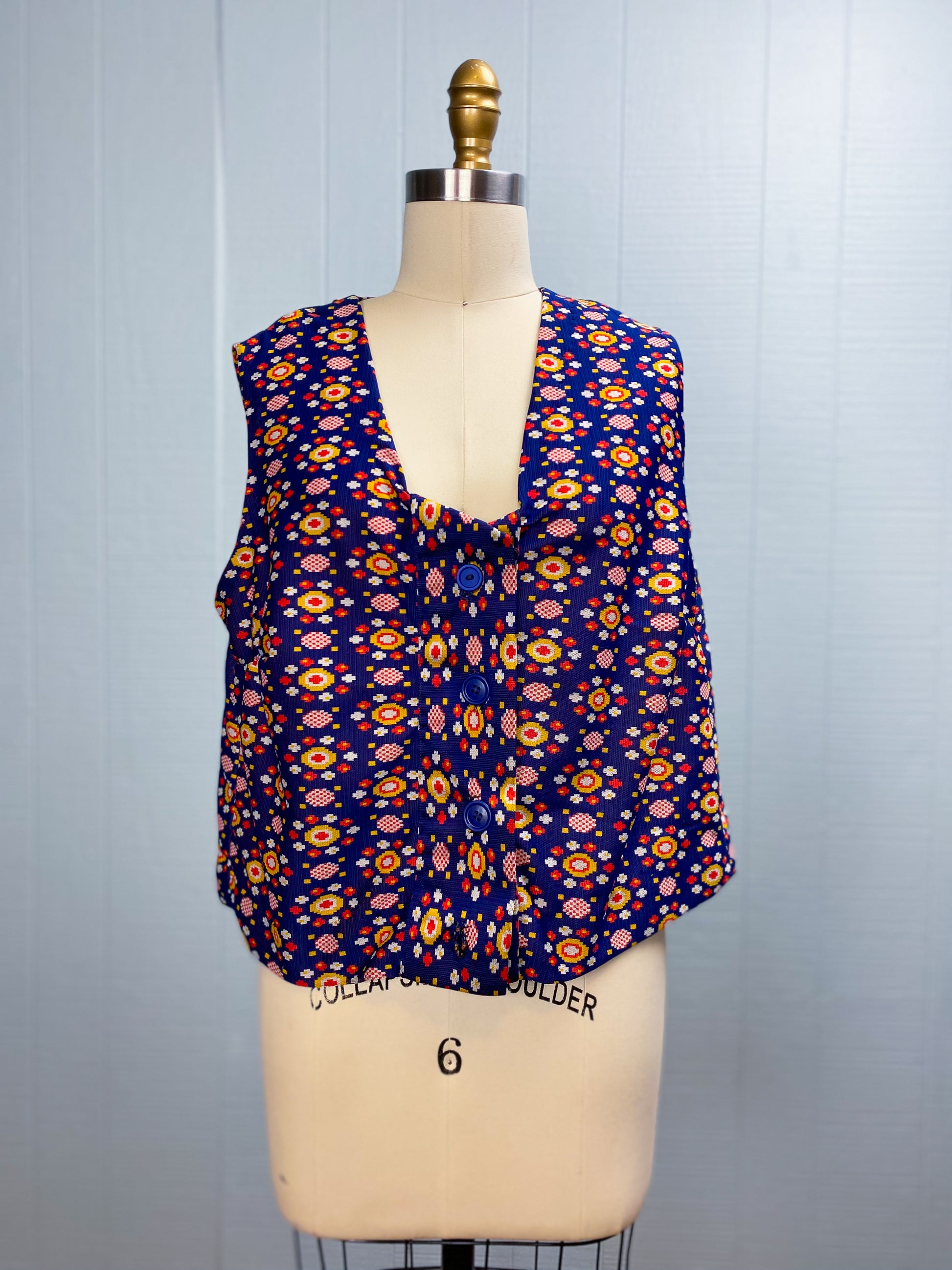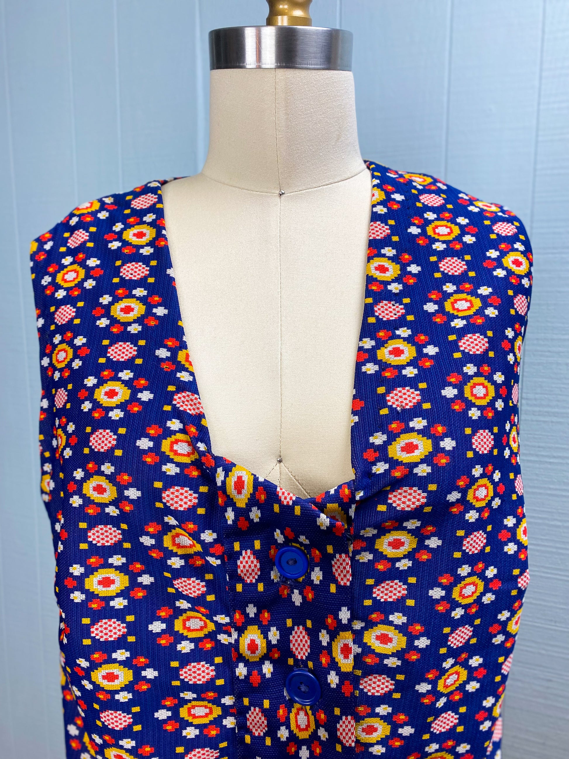 70s Navy Yellow Orange Patterned Button Vest | XL