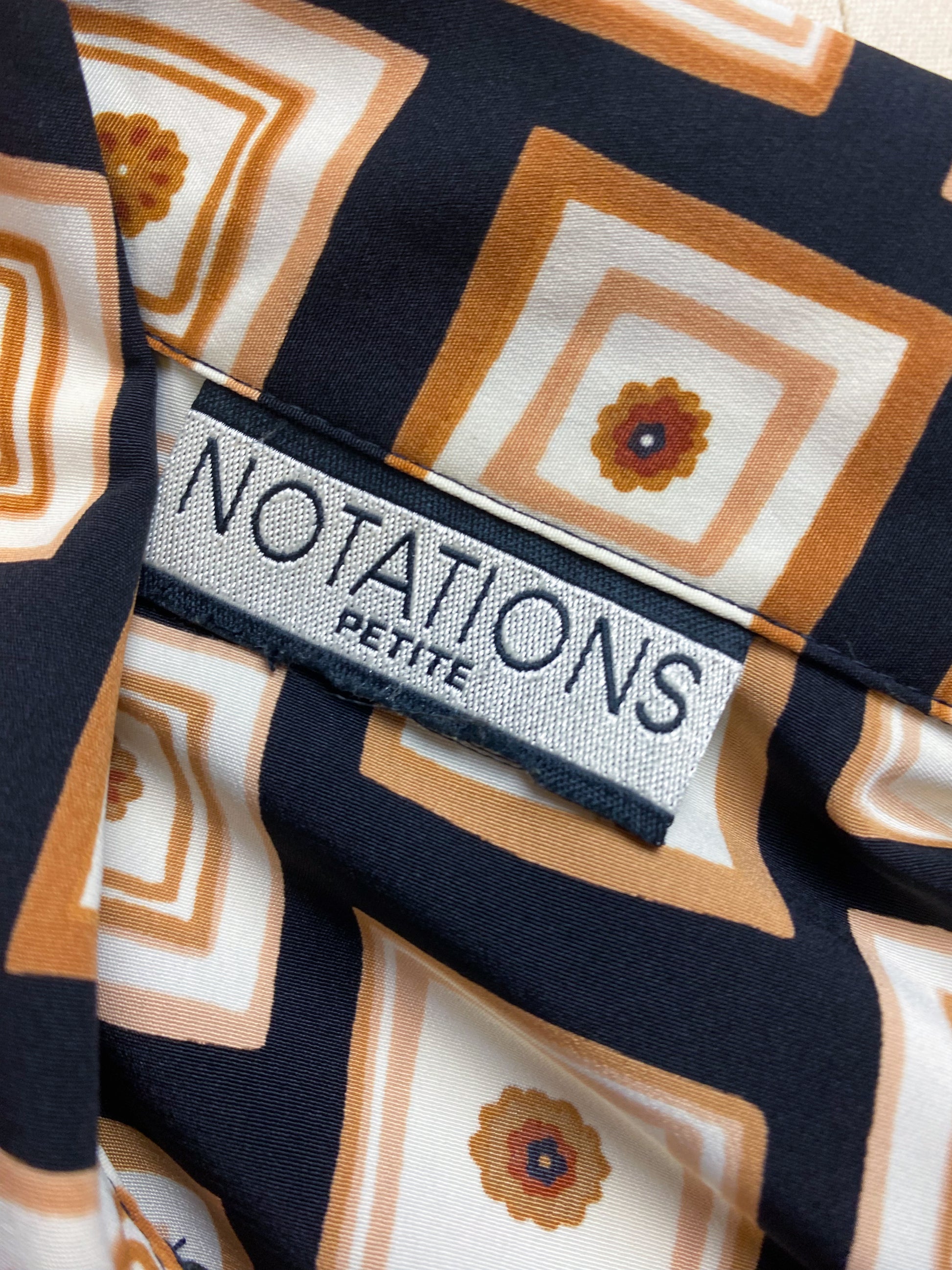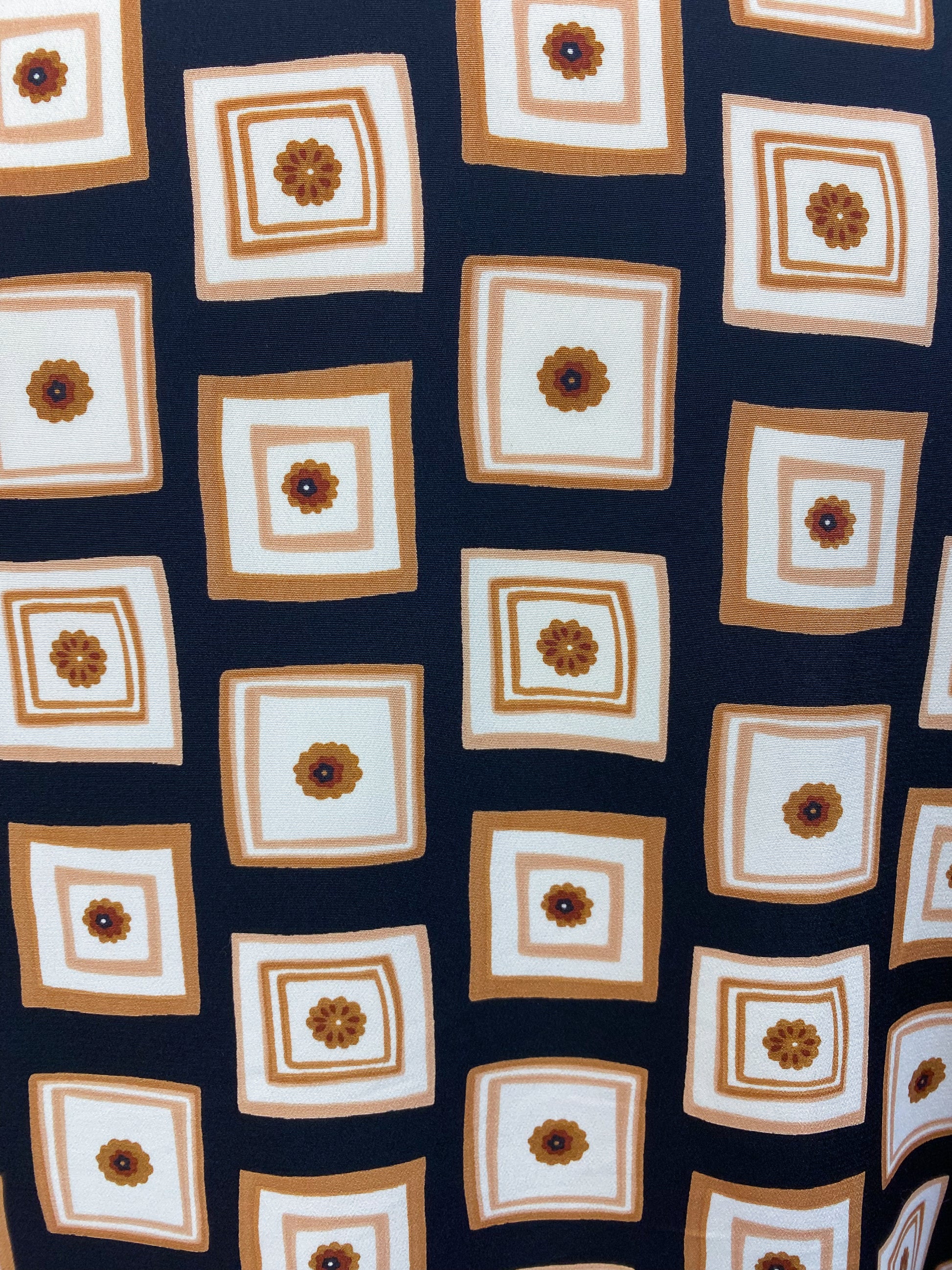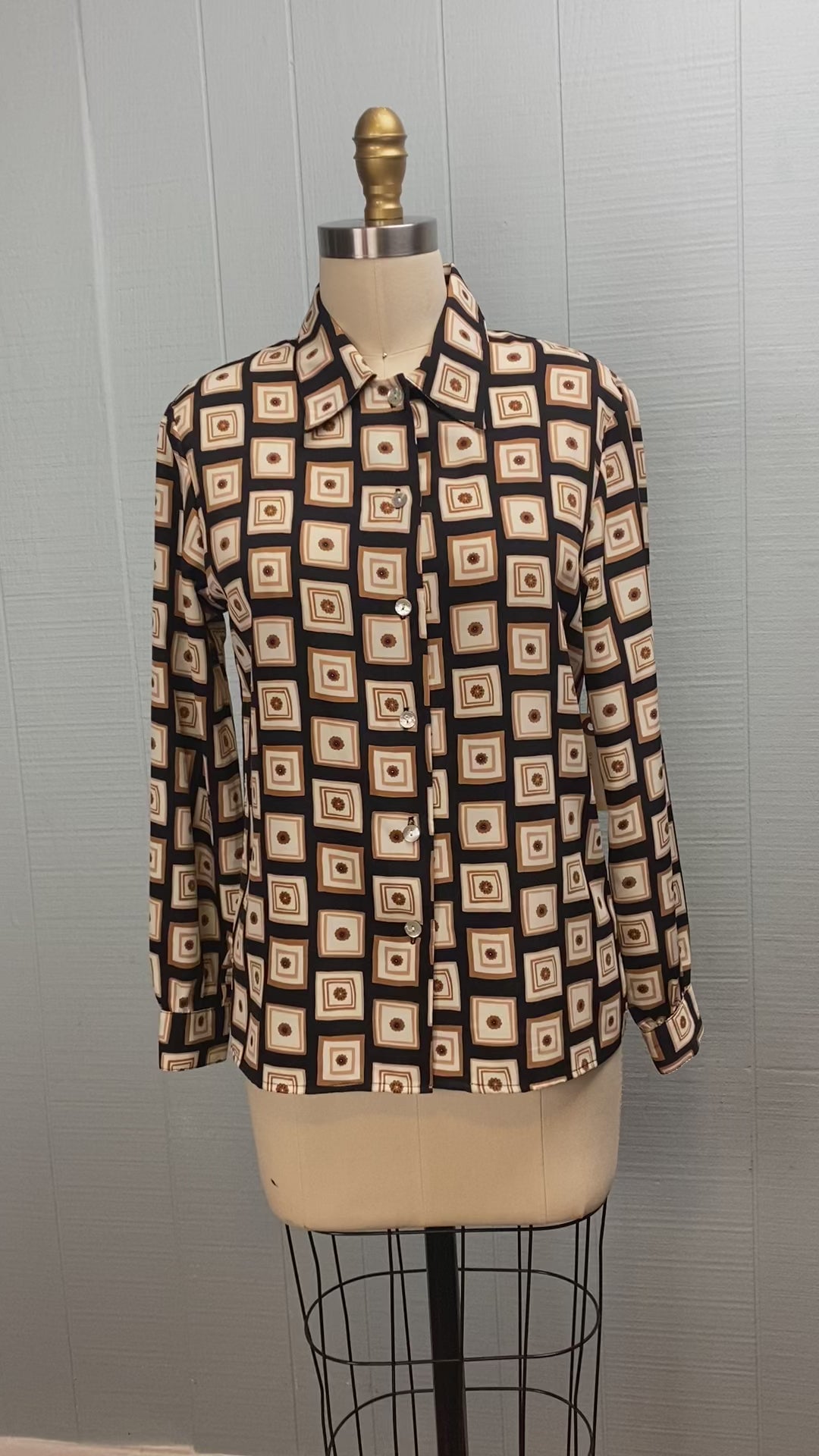 Fabulous geo print with tiny flowers at the center of each square, button front with pearlescent buttons, small shoulder pads, pointed & shaped collar, long sleeve gathered into the cuffs