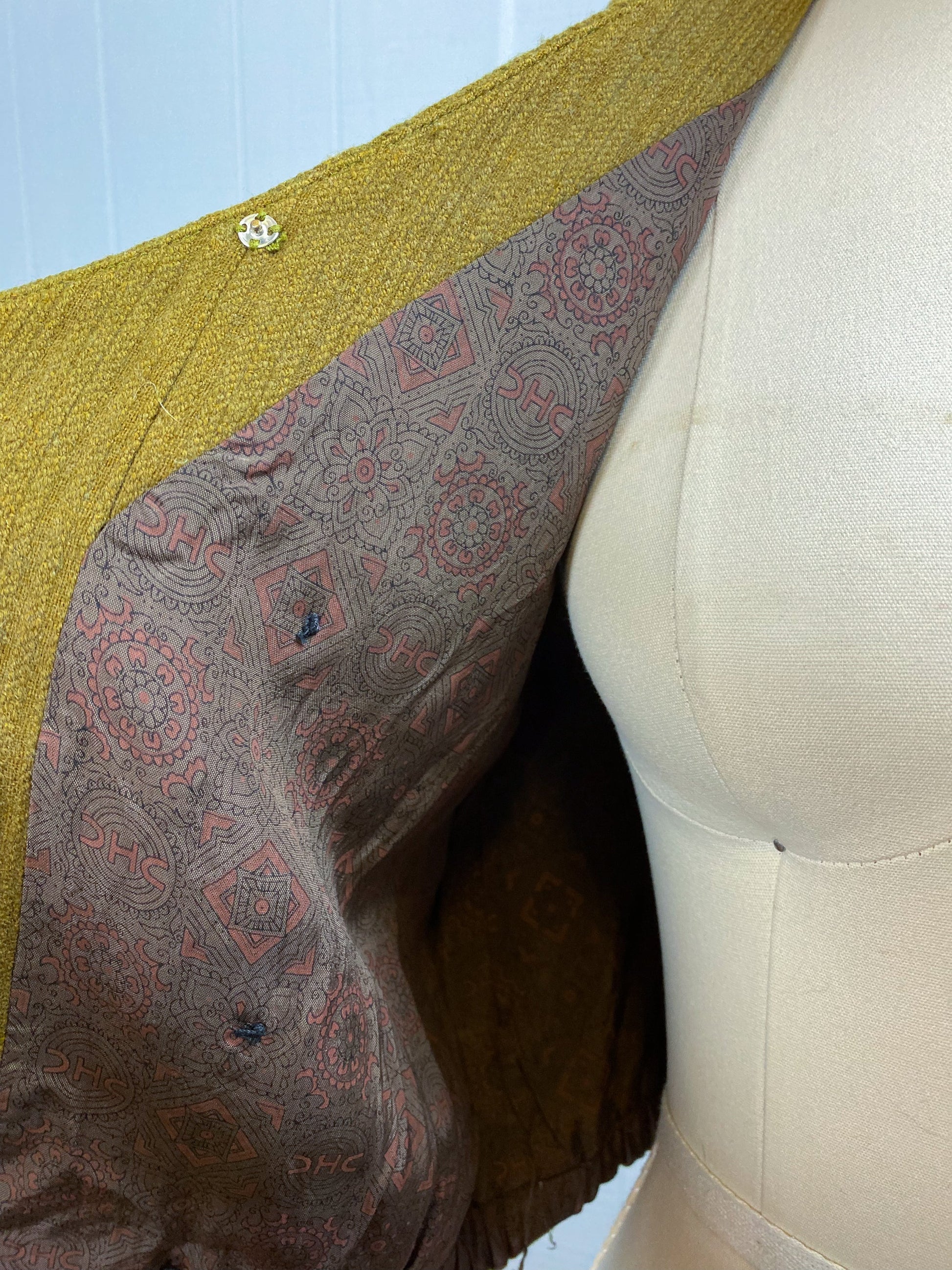 Material: Unknown, feels like a brushed/textured cotton, almost corduroy like - color is an olive green or antique green/gold
