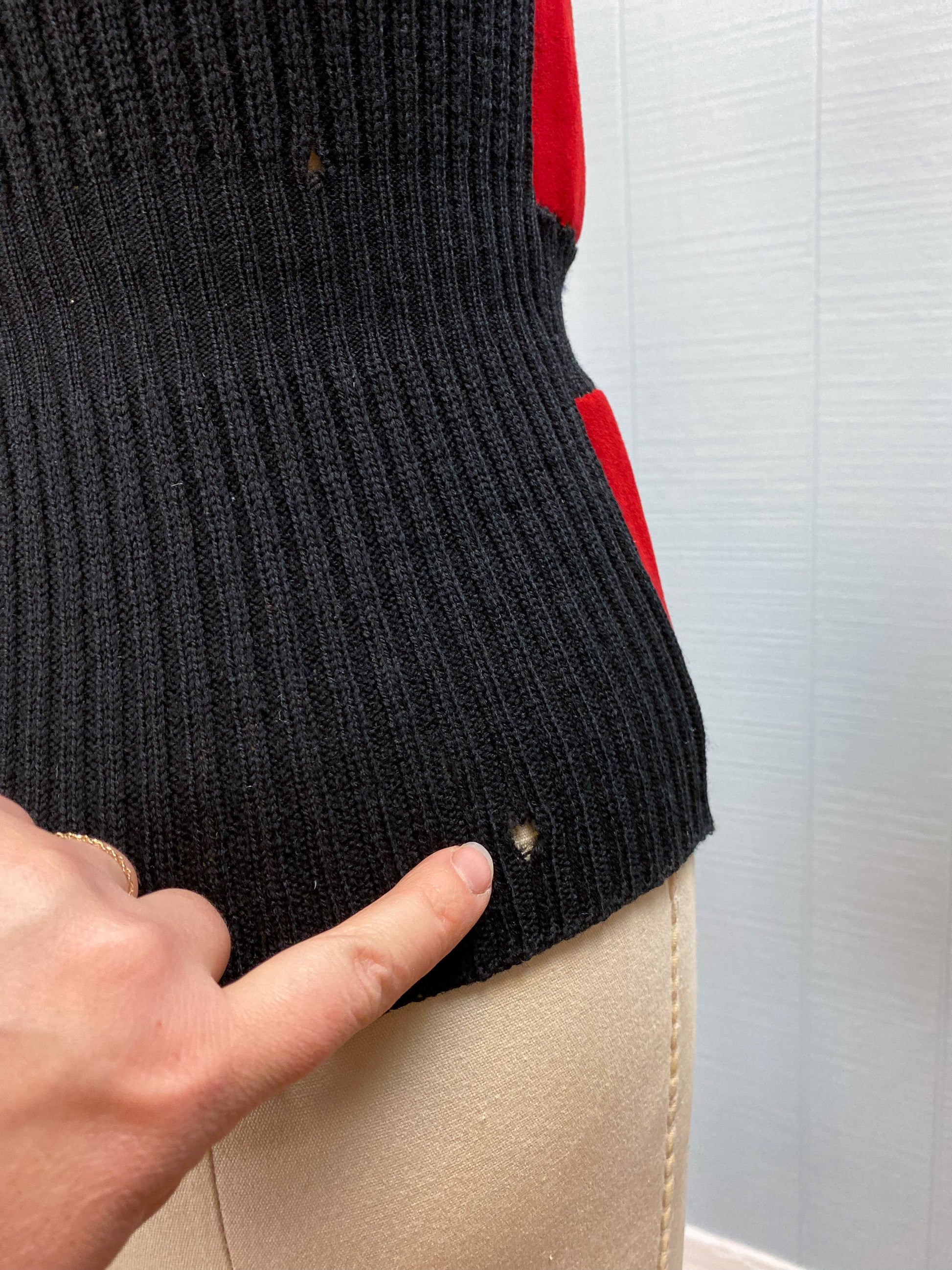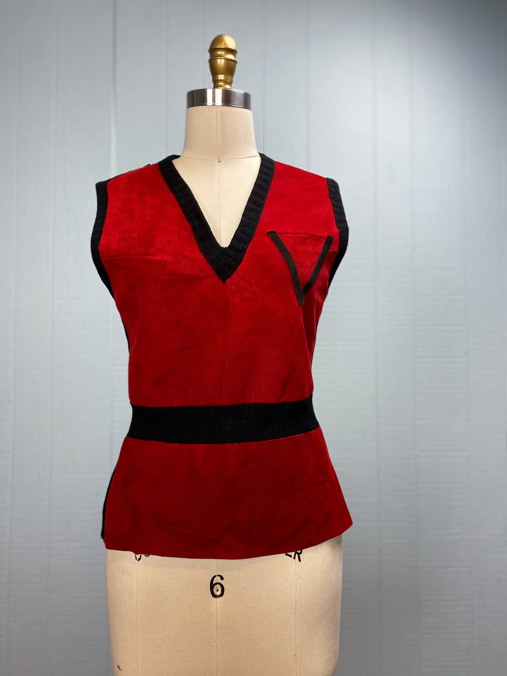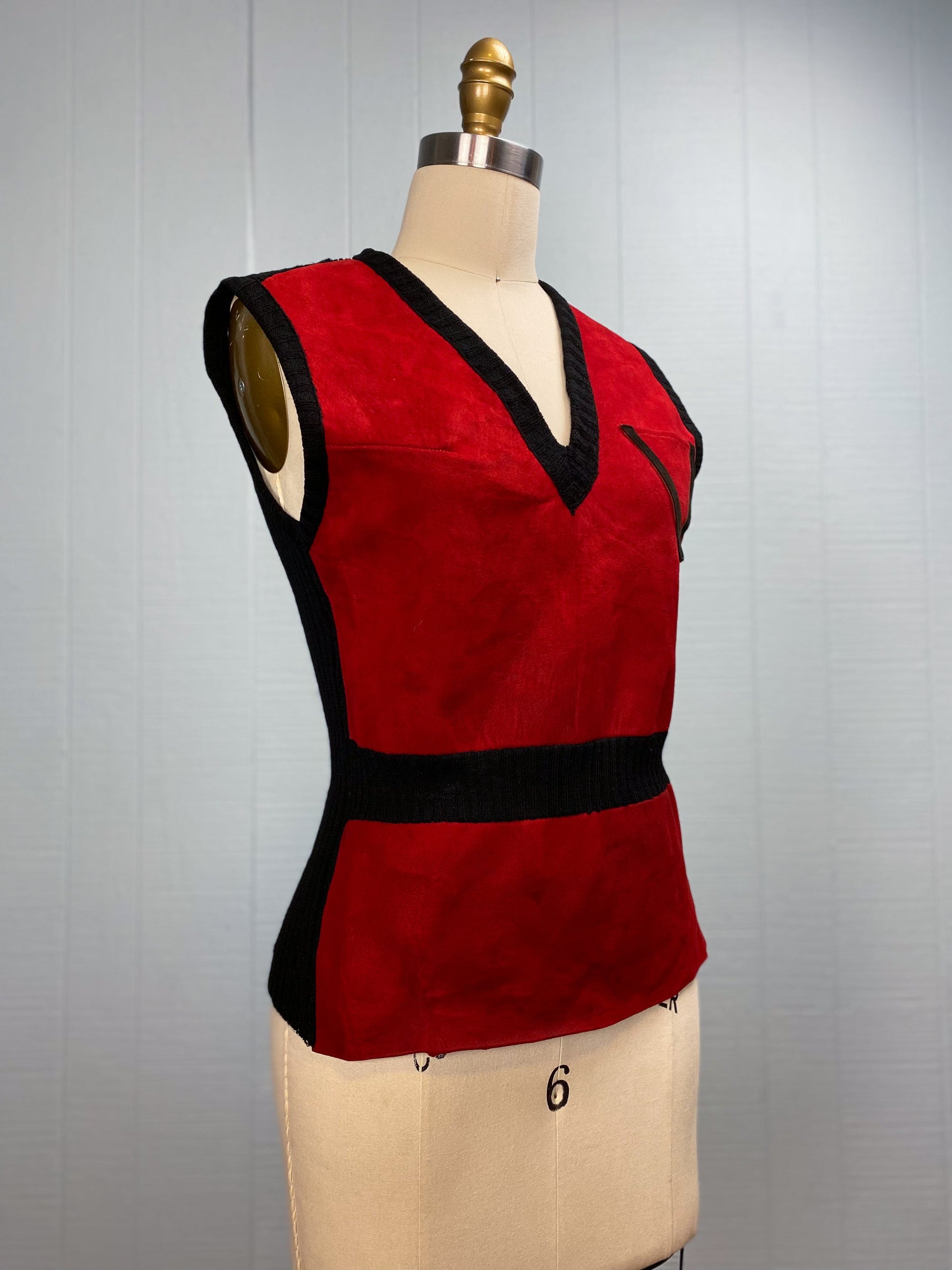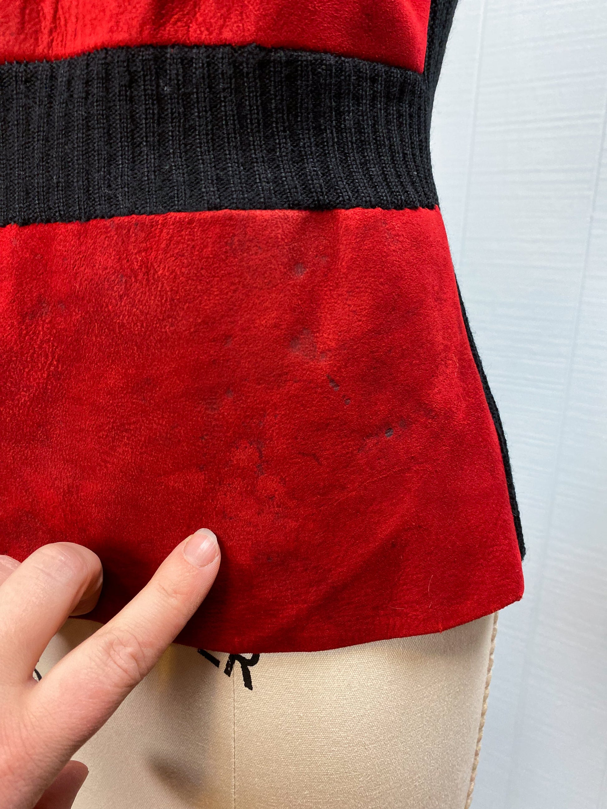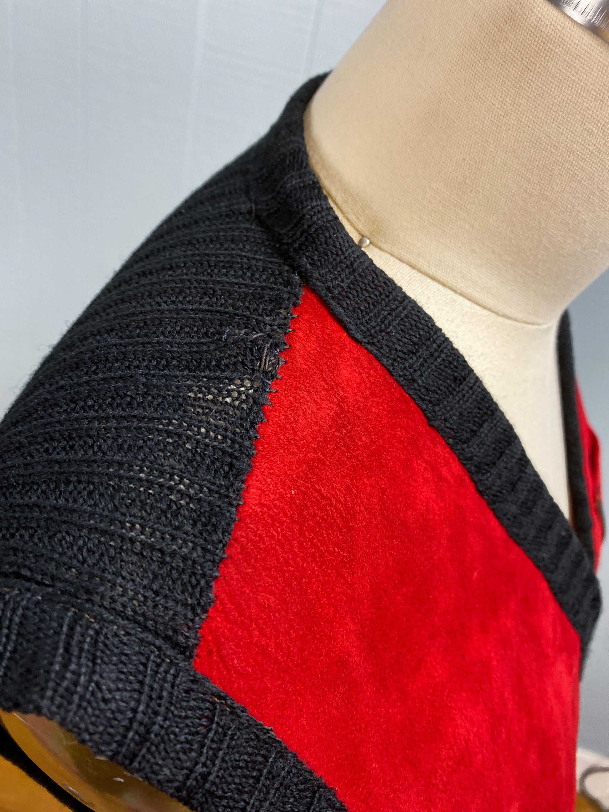60's 70's Red Suede & Black Sweater Ribbed V Neck Vest | S/M
