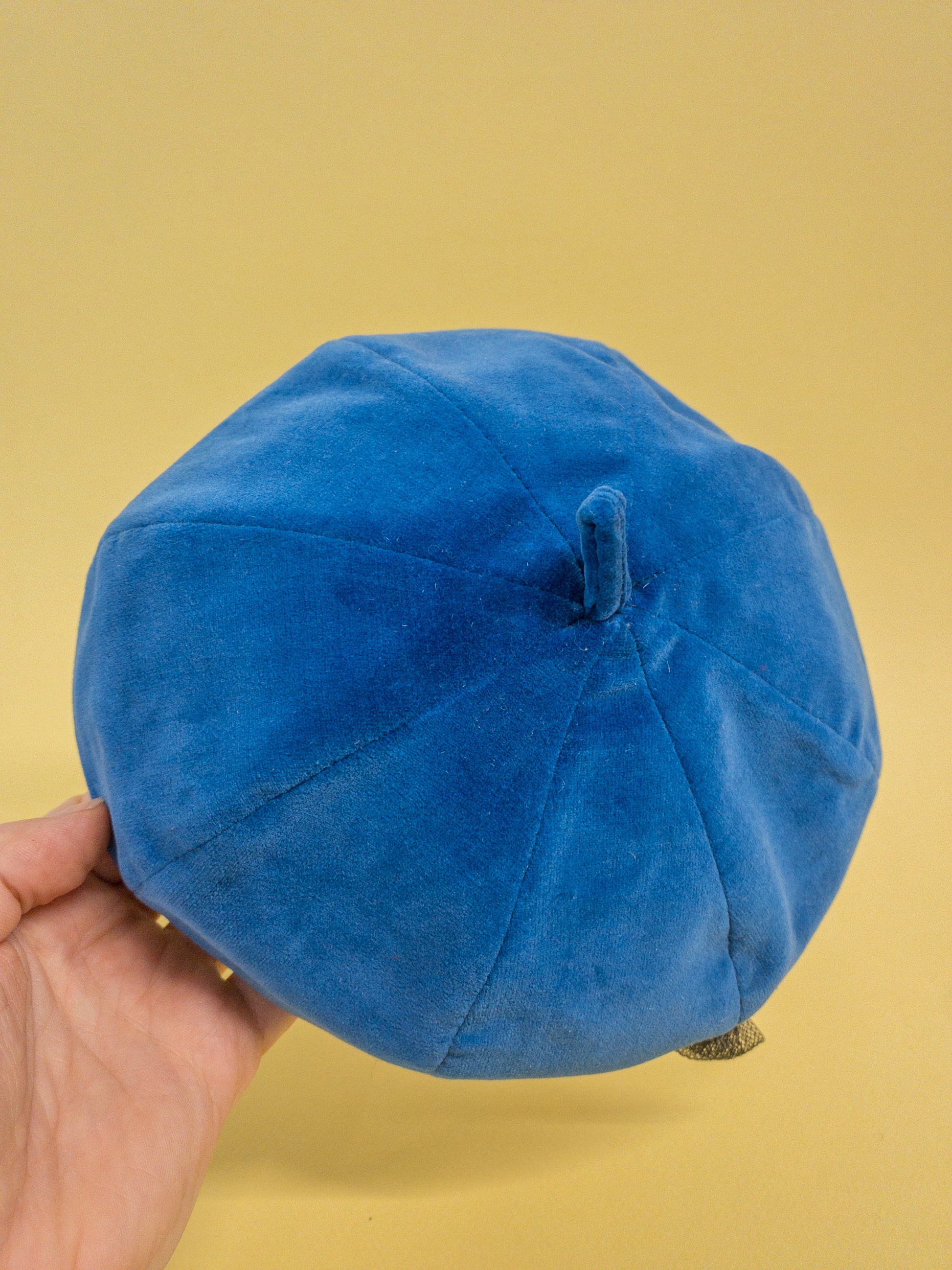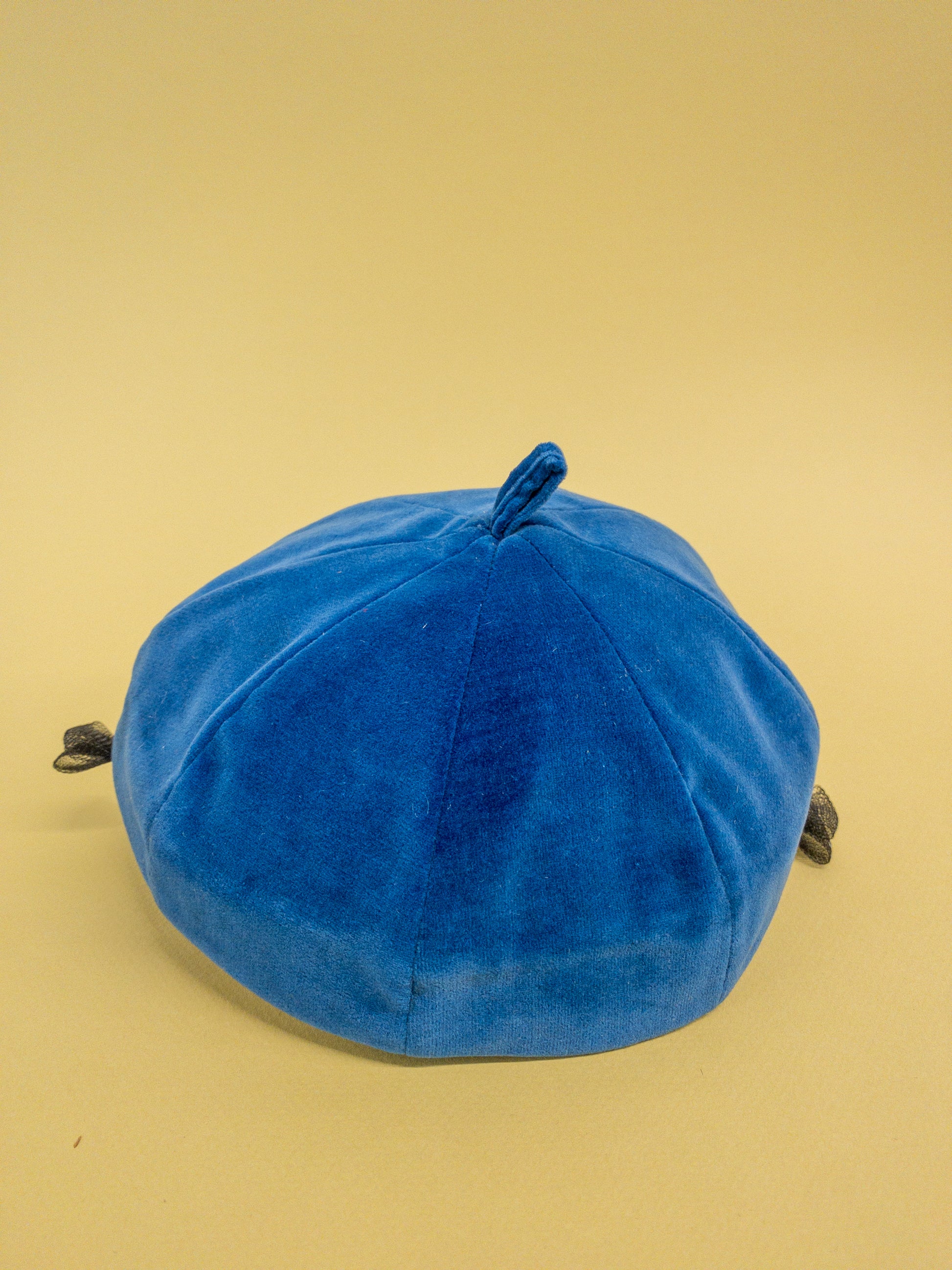 The sweetest little cap in royal blue velvet, made with 8 panels creating a cute beanie shape, finished with a little tab at the crown.