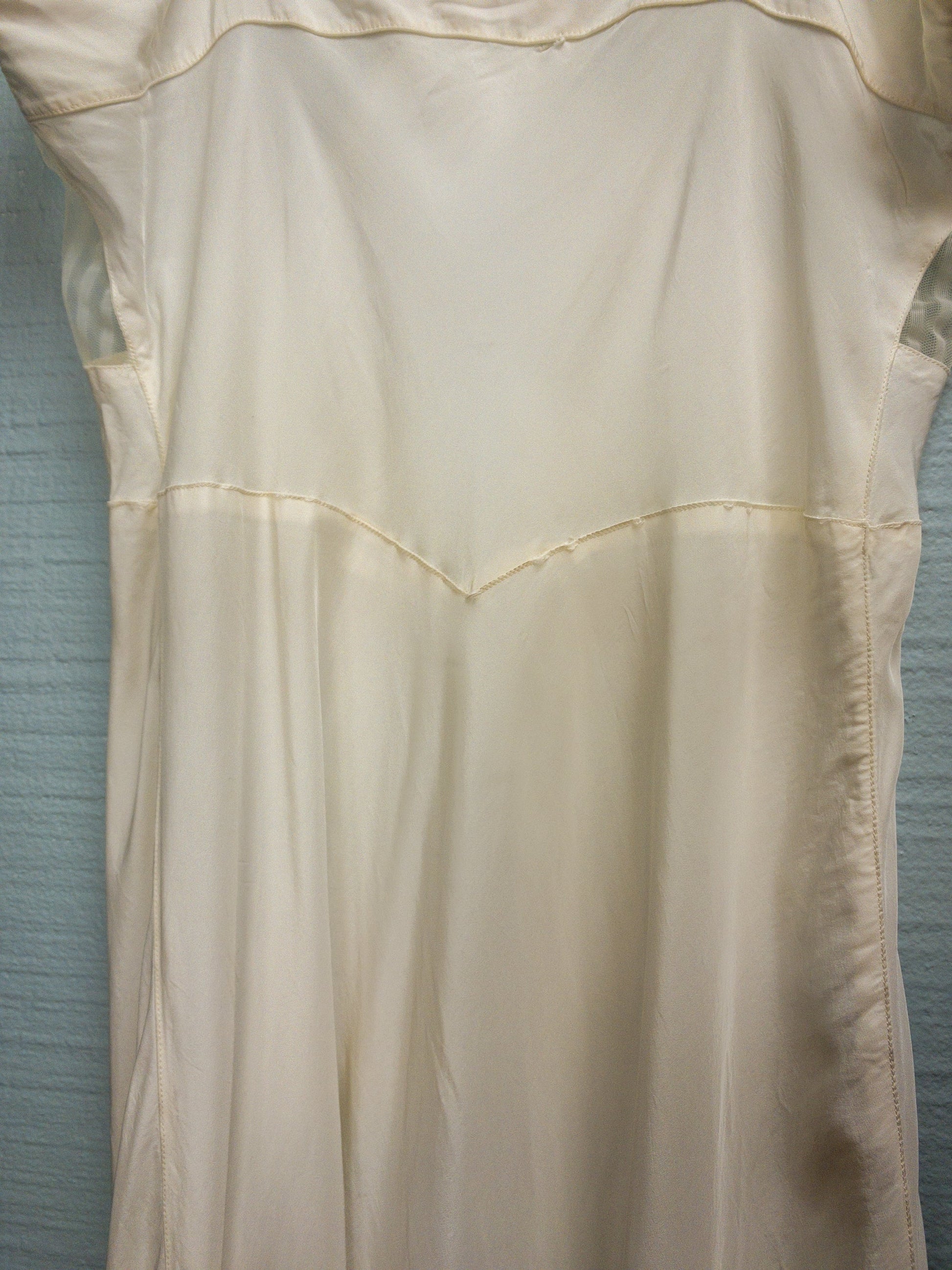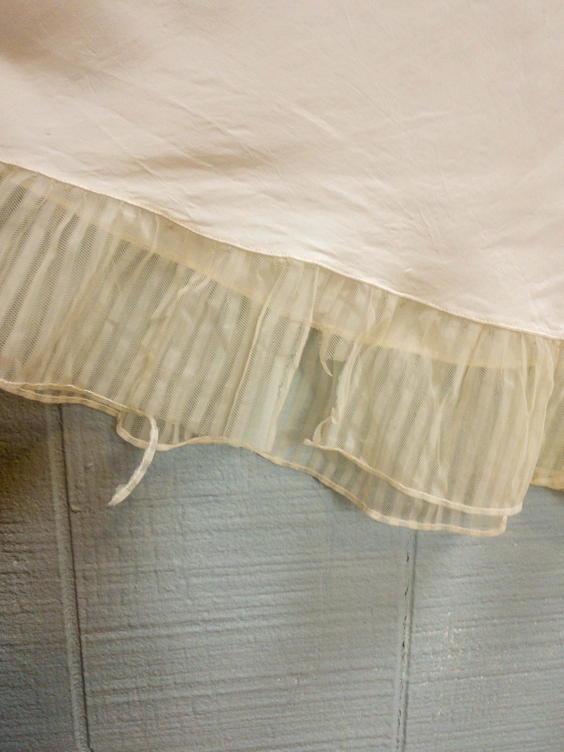Condition: Fair, construction overall solid, some popped stitches on waistline, tear in hem ruffle