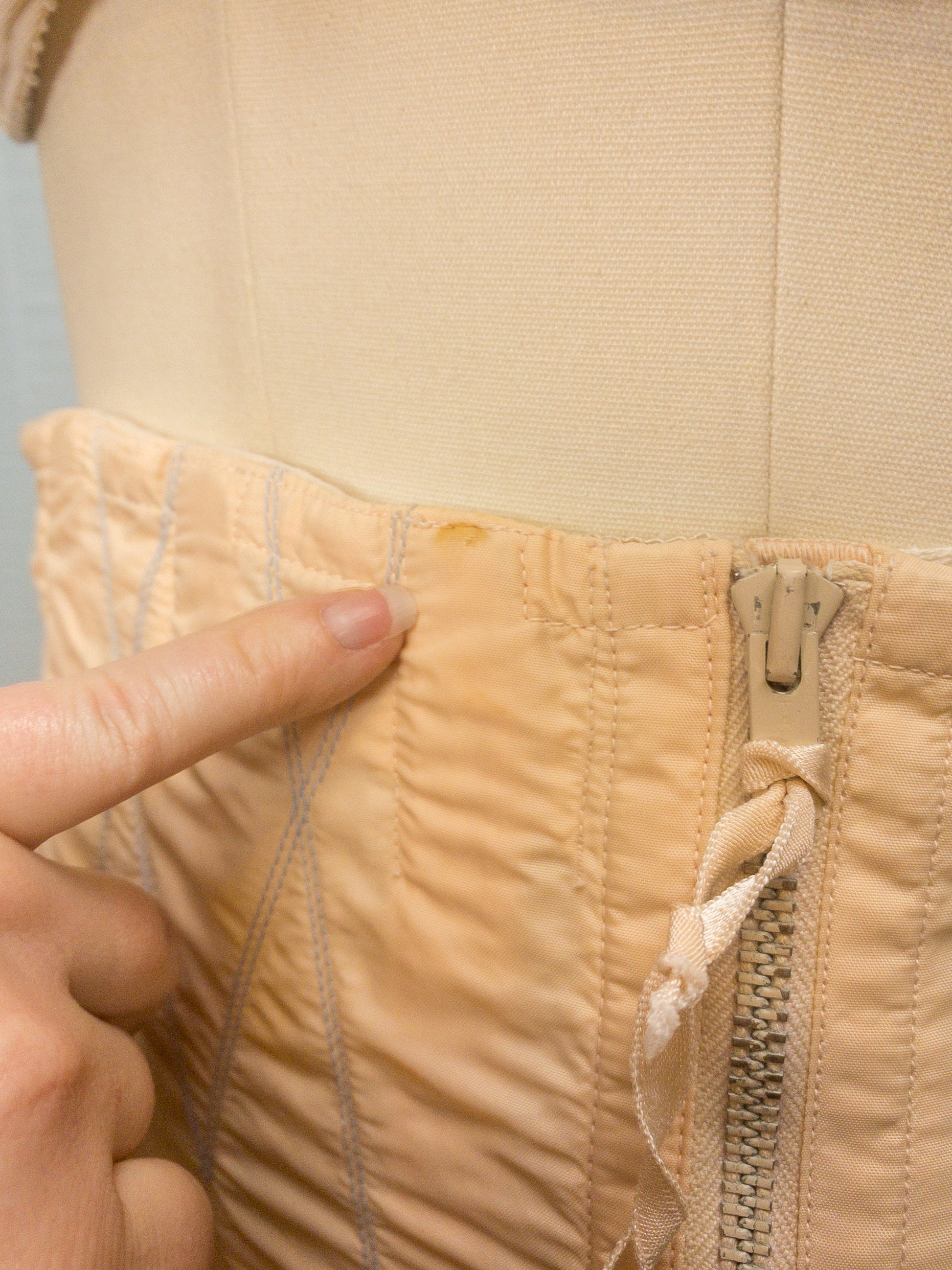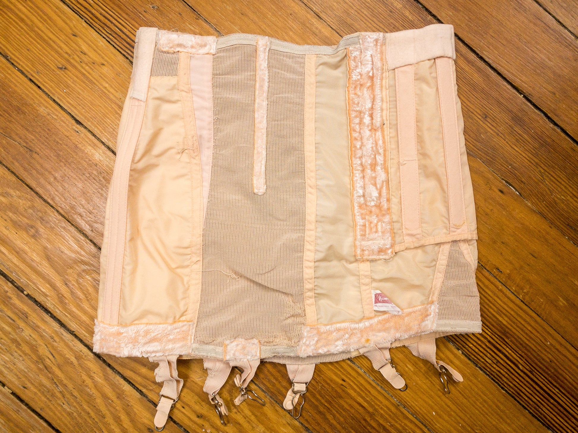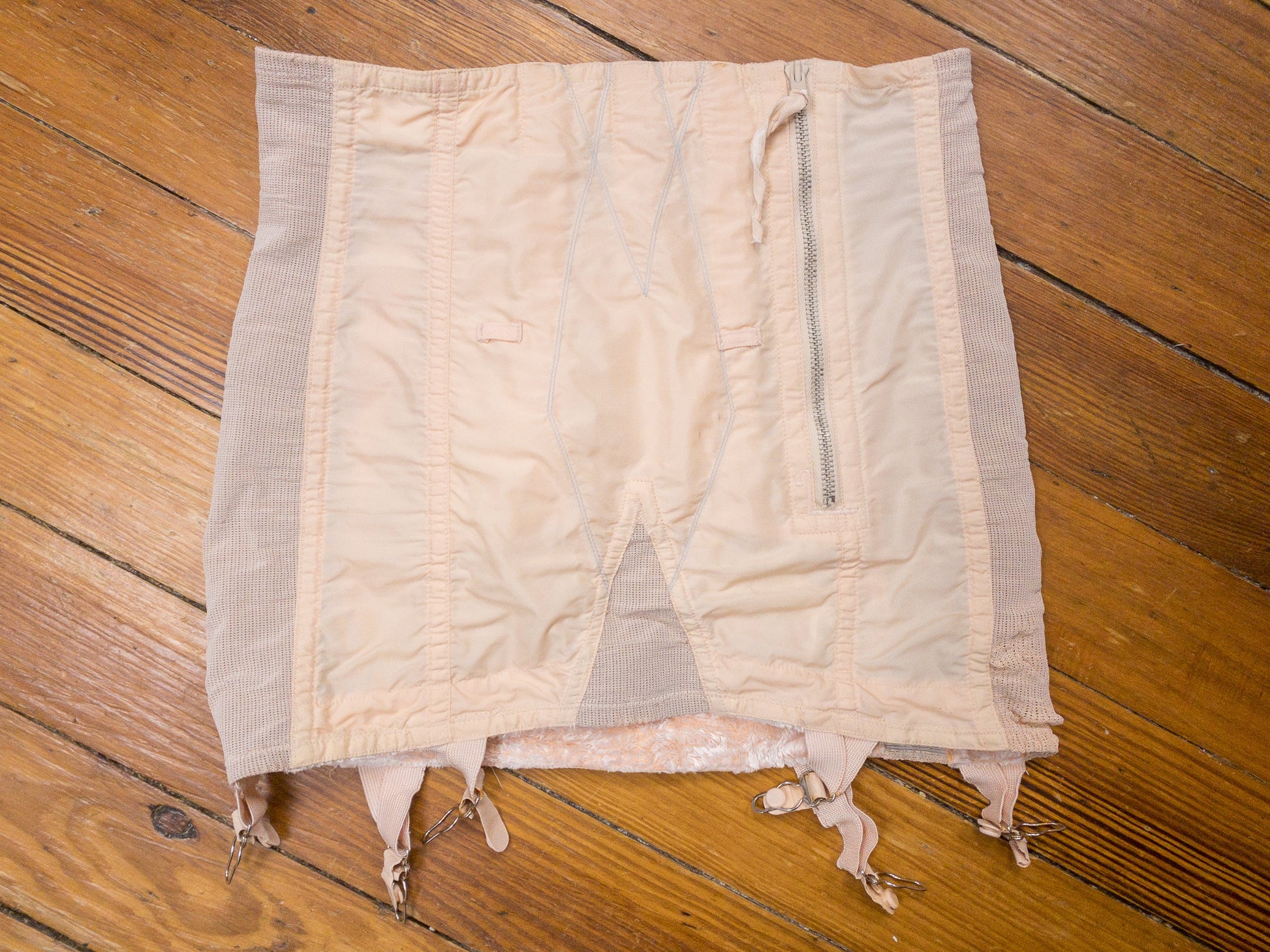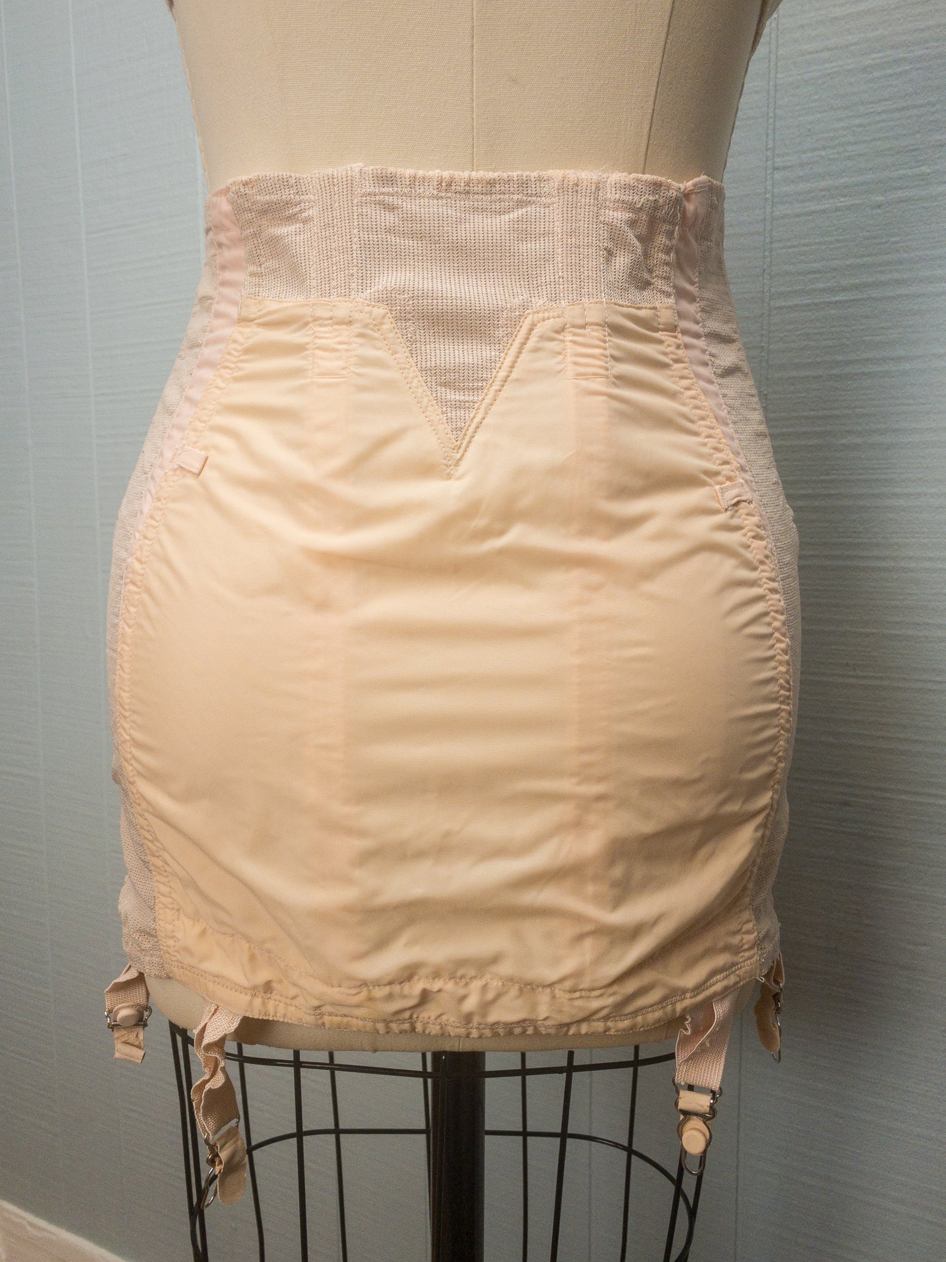 Condition: Good to fair vintage, solid construction, wear according to its age, waistline is stretched so would suit an apple shape best (waistline is pinned on mannequin), some marking & discoloration, all garter clips are in tact but are brittle