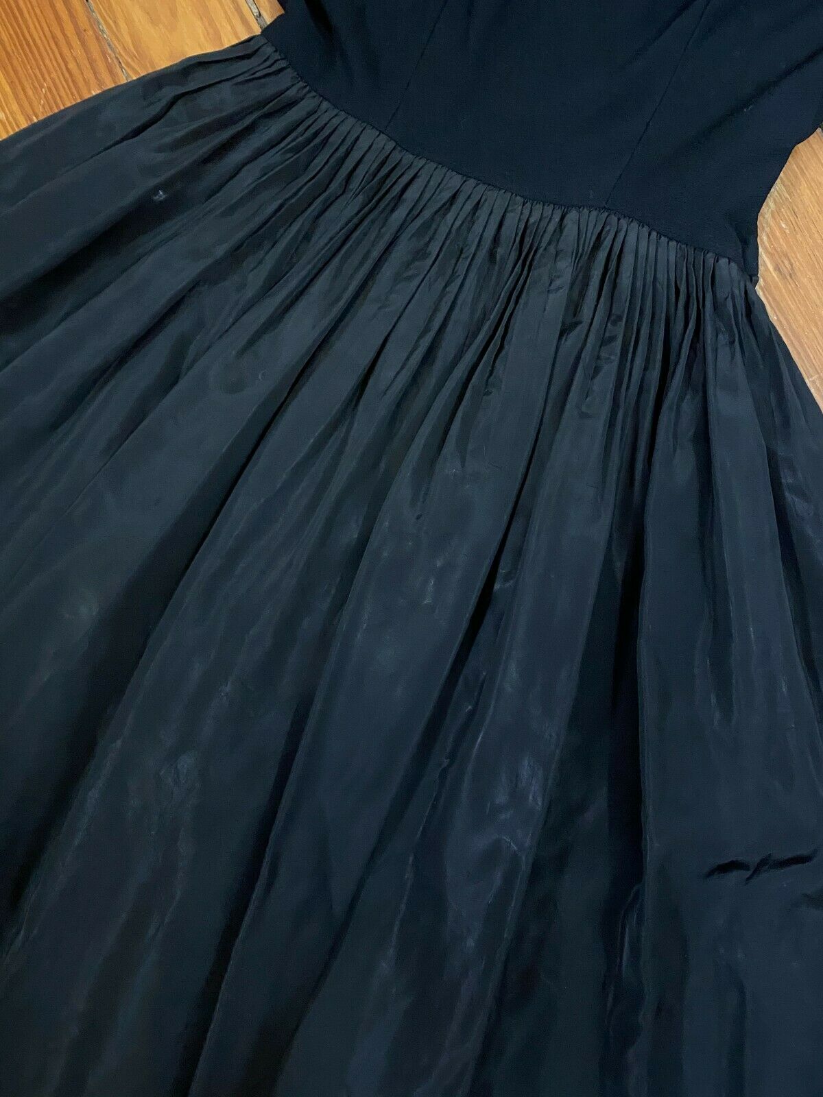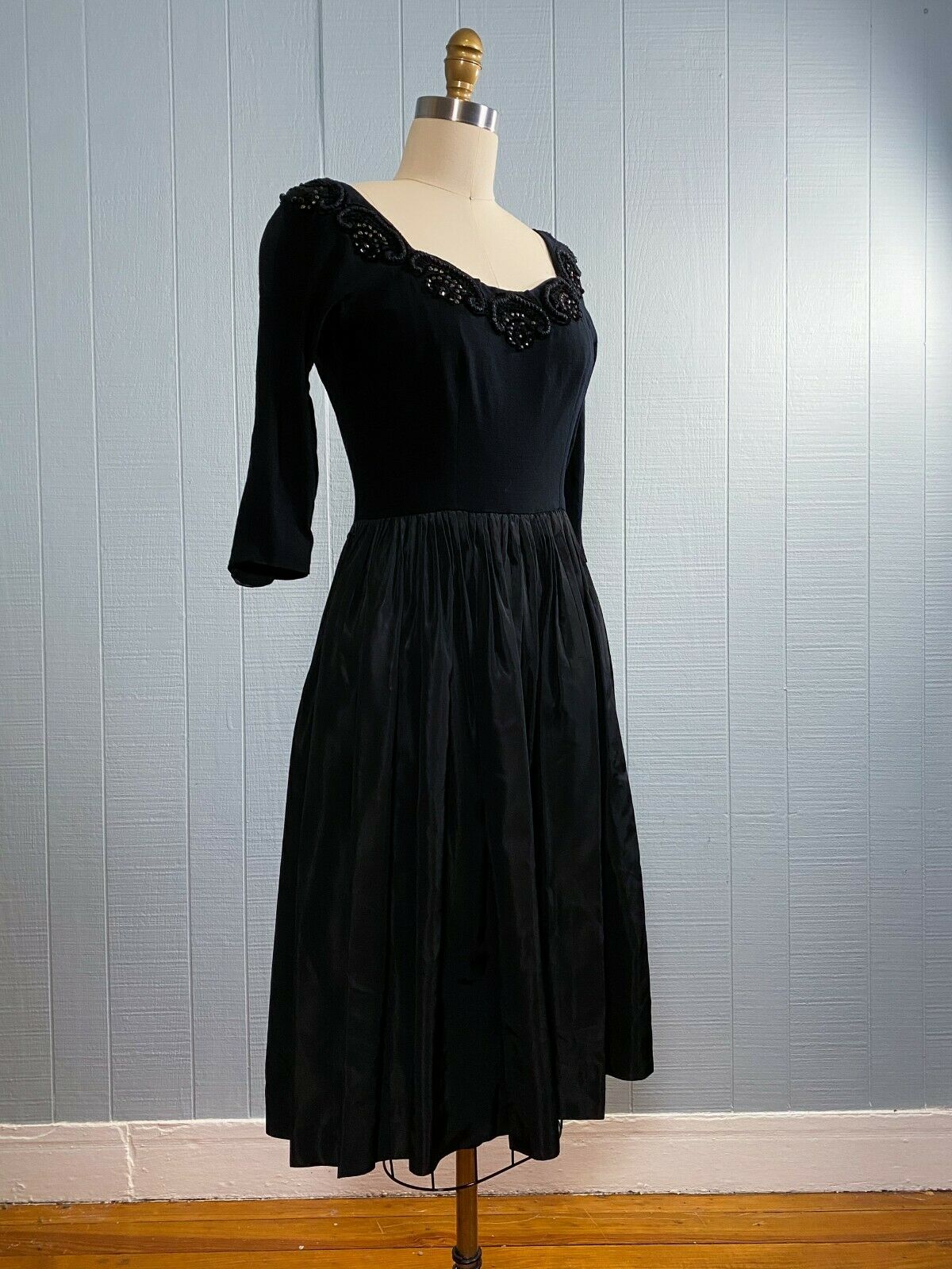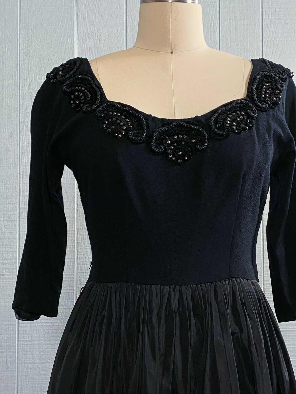 40's/50's Black Jeweled Fit & Flare Dress - wool gabardine bodice embellished neckline of cord, metallic thread and metal studs - wide sweetheart neckline - 3/4 length sleeve, cut as one with bodice, gusset at underarm - waist to bust point darts for light shaping - cinched waist that opens to pleated taffeta below knee circle skirt - metal side zipper
